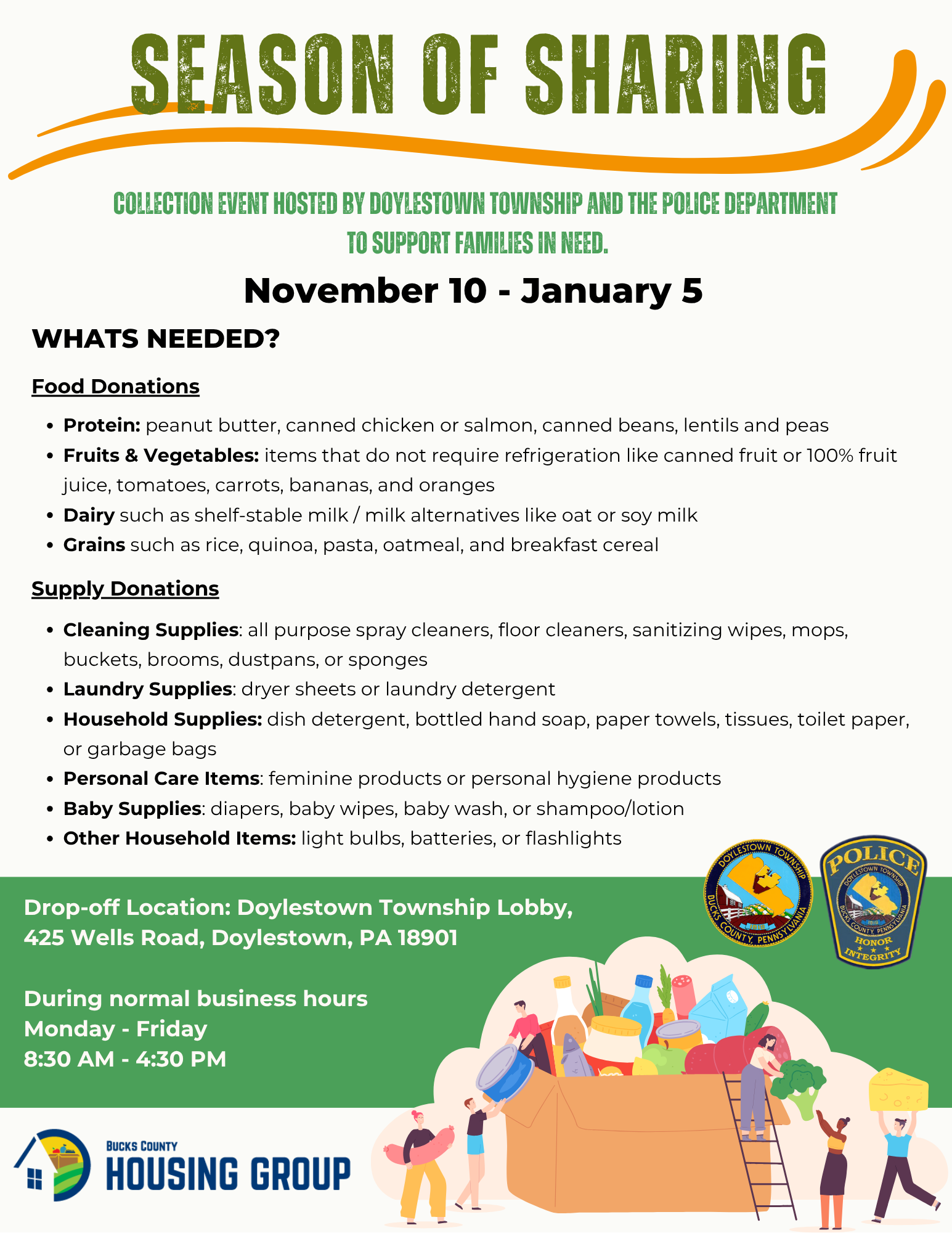 In the spirit of giving, we are thrilled to announce our annual Food/ Supply Drive in conjunction with the Bucks County Housing Group , and we invite YOU to be a crucial part of this impactful initiative! With the holiday season around the corner, we're determined to make a difference in the lives of those who may be facing food insecurity. Your generosity can change lives. All you have to do is gather non-perishable food items and supplies (listed on the flyer below) and drop them off at the Township Budling, located at 425 Wells Road, during normal business hours!