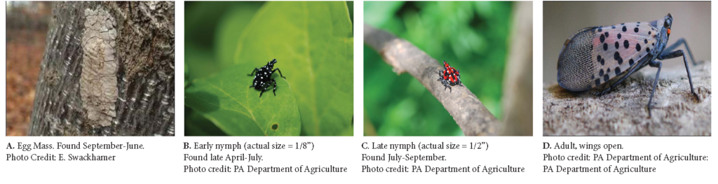 See the pictures below that illustrate the SLF at all of its life stages: egg masses, nymph and adult.